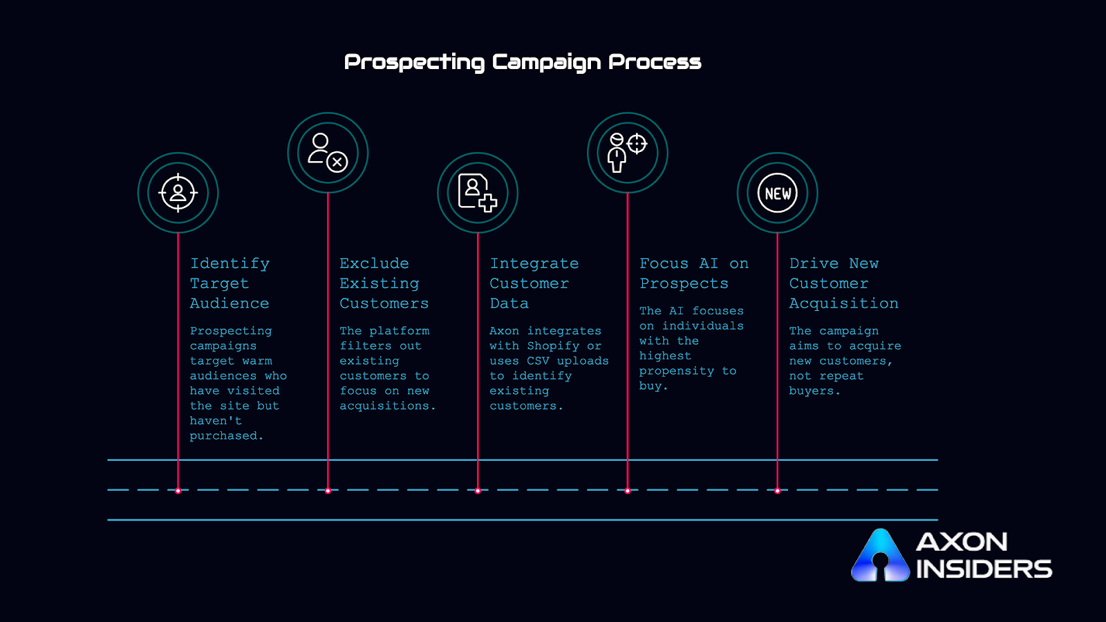 That's exactly what this sequence does. You're giving Axon's AI a precise job at each stage: find me people who've never been here (Discovery Campaigns), then convert the ones who came but didn't buy (Prospecting Campaigns).