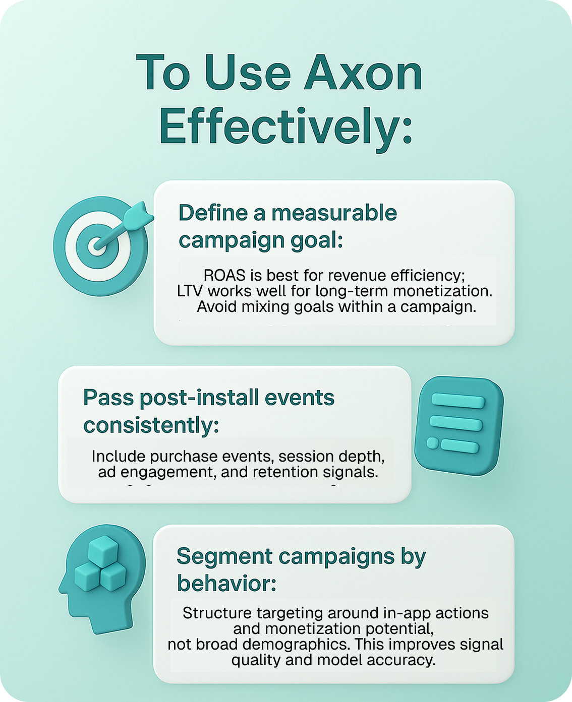 Studios that get the most out of Axon treat it as a learning system. They launch campaigns with a structure designed to feed Axon the right inputs and adapt based on performance.