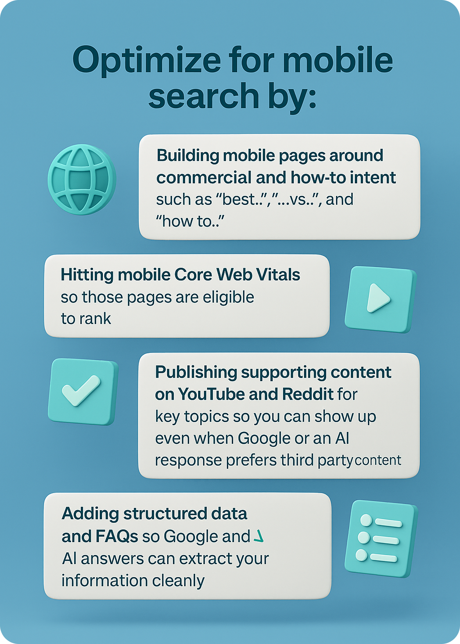 Google still crawls and ranks the mobile version first, so your mobile site has to load quickly, render cleanly, and answer intent directly. This is more than making it responsive. It is making sure product pages show the essentials above the fold, Core Web Vitals are in range on mobile, and commercial pages match the queries people actually type on phones.