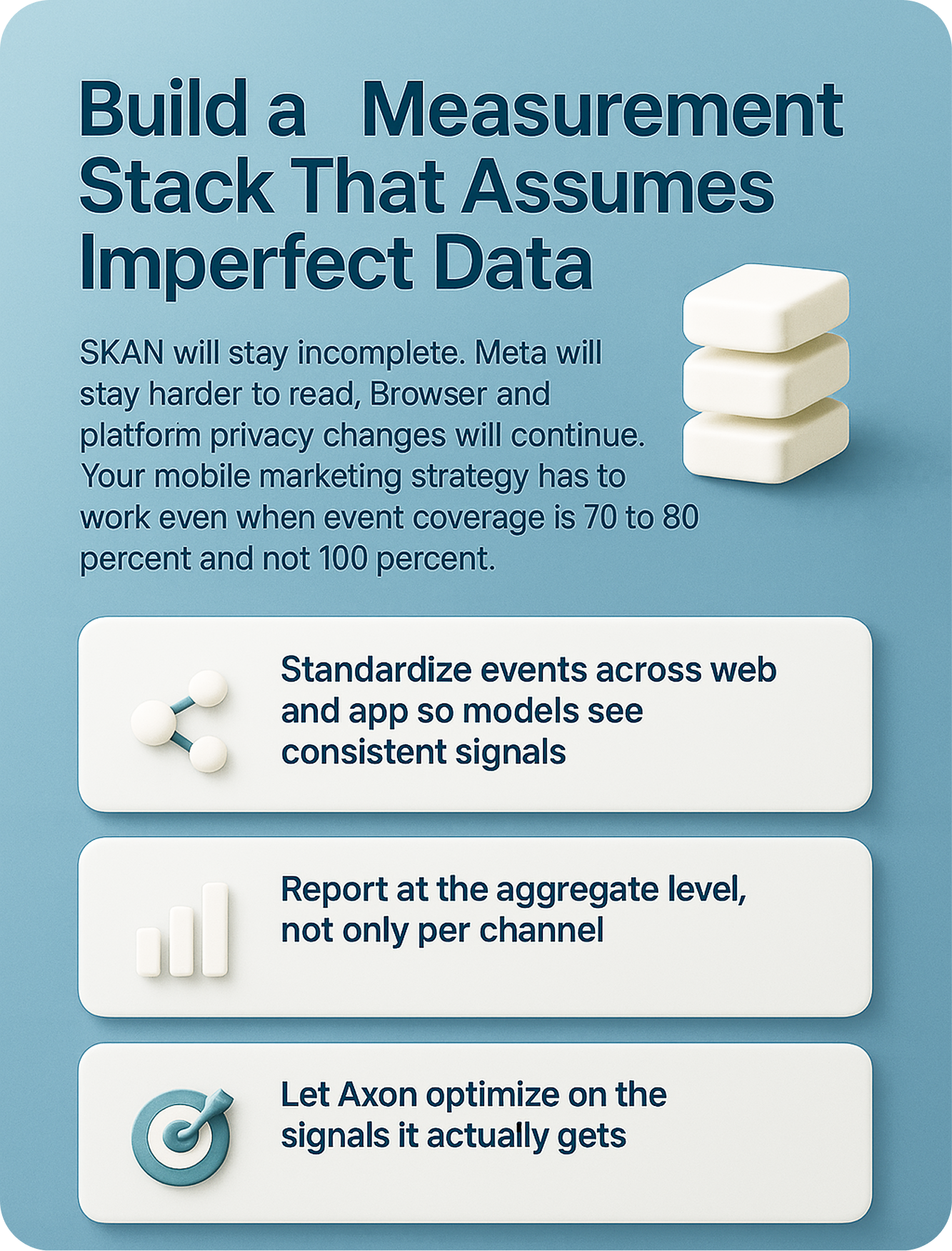 This is the part most teams skip. SKAN will stay incomplete. Meta will stay harder to read. Browser and platform privacy changes will continue. Your mobile marketing strategy has to work even when event coverage is 70 to 80 percent and not 100 percent.