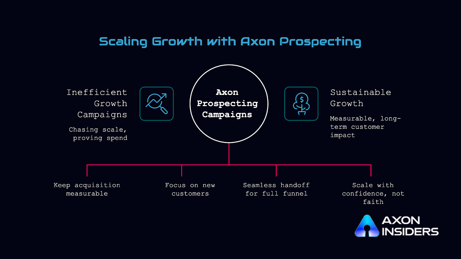 Prospecting isn’t here to replace Universal campaigns; it’s here to make them stronger. Think of it as a growth engine: prospecting brings in net-new buyers, while Universal campaigns capture blended demand across both new and returning customers. Without Universal campaigns, you miss the opportunity to efficiently convert and monetize the full spectrum of demand. Together, they create a balanced approach that drives both acquisition and scale. Axon’s Prospecting Campaigns complement Universal campaigns seamlessly, ensuring you’re not just sustaining blended demand but continuously expanding it.