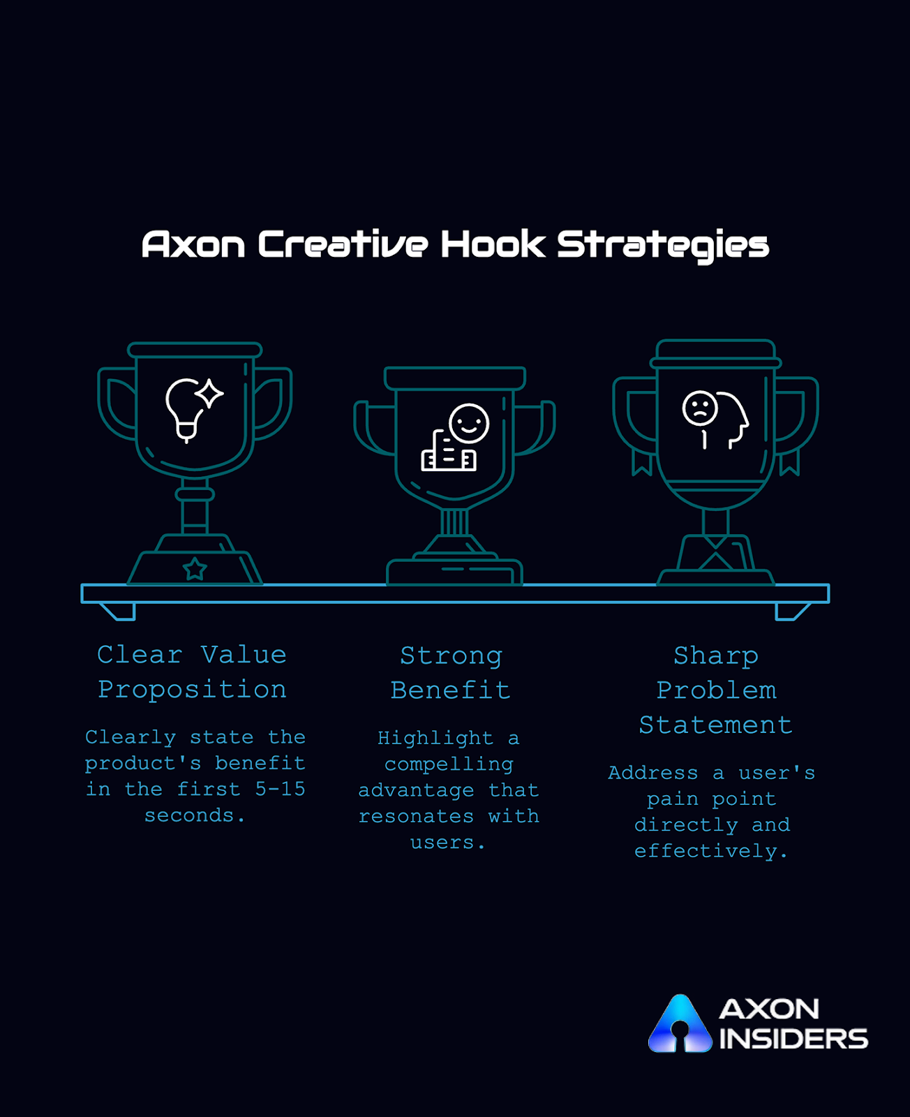 The hook must connect directly to what follows. Social-style clickbait hooks that do not relate to the product tend to underperform here. On Axon, you have permission to lead with messaging that is actually about the product.
