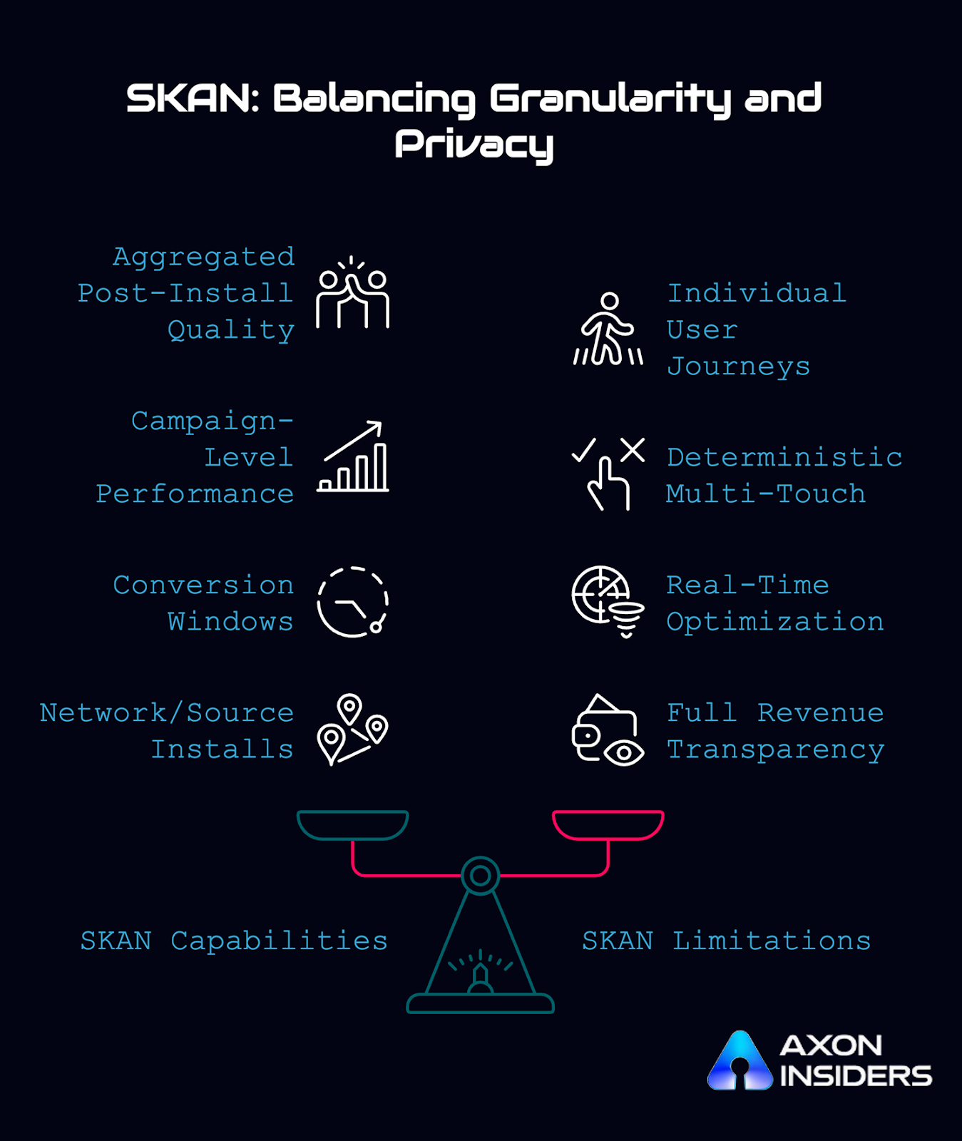 SKAN shifts attribution from user-level data to aggregated postbacks, meaning advertisers receive campaign summaries instead of individual user journeys.